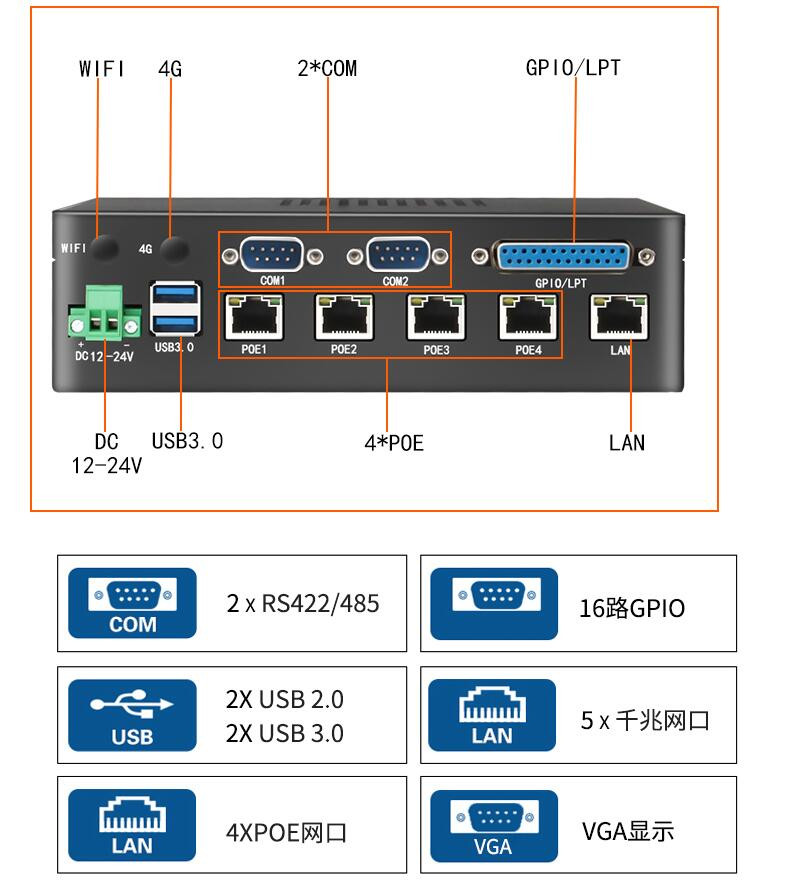 5)Main Port: 1X VGA + 2X RS232 + 2 XUSB3.0 + 2 XUSB2.0 + 1 X GPIO + 5 X intel gigabit LAN;